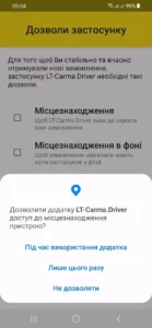 - Програма попросить дозвіл на відображення поверх інших програм. Це необхідно, щоб нові замовлення могли з’являтися поверх інших вікон, навіть коли програма LT-Carma.Driver знаходиться у фоновому режимі.