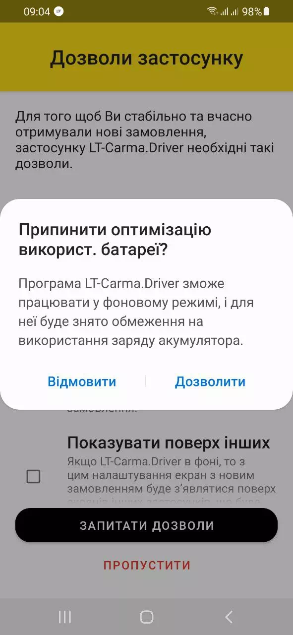 - Програма попросить вимкнути оптимізацію батареї, щоб вона могла працювати у фоновому режимі без обмежень на використання заряду акумулятора та запобігати переходу в сплячий режим під час очікування замовлень.